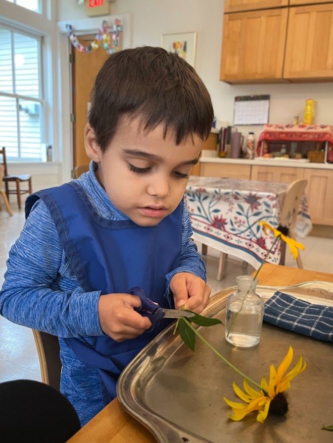 Taking care of living things, both inside and outside the classroom is modelled and practiced: watering plants, feeding the fish and making sure the earthworms go back where they belong! We are grateful for the large windows in both of our classrooms, which allow us to quietly observe, turkeys, an occasional deer and birds coming to our bird feeders in the winter. An underlying theme in our curriculum is the one of “Cosmic Education”, the idea that we as individuals are a part of something bigger. Children are taught their “cosmic address” starting with the earth, the continent, the country, the state and the town that our school is located. By learning about our environment and the diverse environments and cultures found across the world, children are able to find similarities and appreciate the differences. They are able to start developing their own identities and form a deep connection with everything, living and nonliving, around them.
