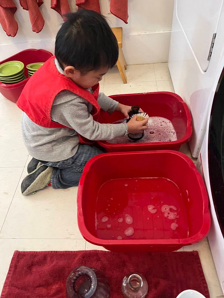 Any job that can be done by the children is taught to the children! In addition to being responsible for their own bodies and belongings, they can also help keep their classroom home clean and tidy. They help sweep, wash windows and fold the laundry whenever they realize those chores need to be done!