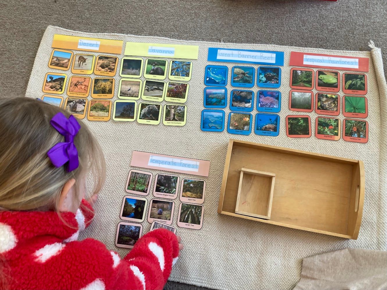 Order is built into everything we do at the school, the works, the routines as well as a place for every object in the classroom. As the children move through the works, they focus on putting objects in order with sorting and grading them. All work is done from left to right in order to train the eye for reading as they get older.